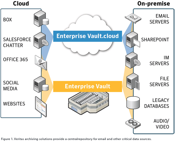 Using Enterprise Vault and Enterprise Vault.cloud, you can define policies that can automatically archive email, email attachments, and other critical information sources, whether they are on-premise or in the cloud, into a searchable repository for compliance, legal, or internal investigations. For organizations in industries subject to frequent regulation and lawsuits, the need to retain and search across a broad range of information sources is especially acute.