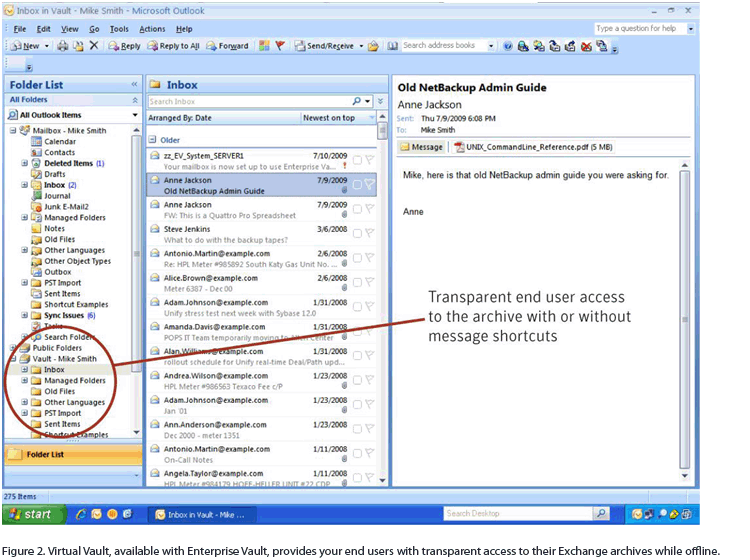 Enterprise Vault comes equipped with Virtual Vault, a unique endpoint client that enables end users to manage and access Exchange archives while offline, including archived .pst files.